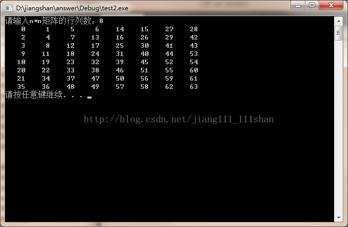 今天花了不少时间来研究如何打印一个之字形zigzag矩阵,参考了下http://blog.163.com/yangjun1988422@126/blog/static/4741291720117842634276/,具体思路和程序在下面。