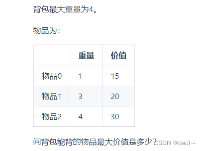dp[i][j]表示背包容量为j时 任意取下标为[0-i]物品进行放置 背包中的最大价值 当背包容量为0时 dp[i][0] 背包中的价值只能为0 只放物品0时 背包容量小于物品重量时 dp[0][j]为0 背包容量大于物品重量时 dp[i][0]为value[0]