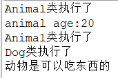 package com.test; public class Animal { public int age=10;//为属性赋初值 public String name; public void eat(){ System.out.println("动物是可以吃东西的"); //这里的父类只是描述动物可以吃东西 } public Animal(){ System.out.println("Animal类执行了"); age = 20;//在执行构造方法的时候再为age赋一个值 //如果在程序中输出这个值,这个值其实应该是后一个的值,因为后面赋的值会把前面的覆盖掉 } }