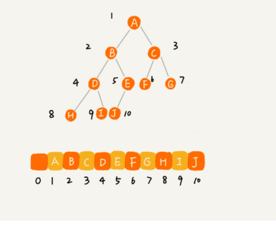 基于数组的顺序存储法,我们把根节点放在数组的第一个位置,从上至下,从左至右依次存储数组种的值。如下图所示,