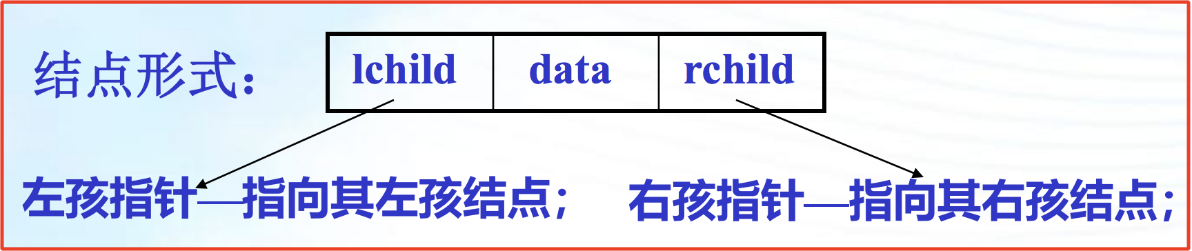二叉链表中结点不仅包含数据域,还包含两个指针域,一个是左孩指针,指向其左孩结点,另一个是右孩指针,指向其右孩结点。
