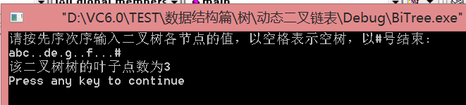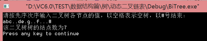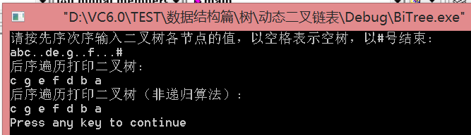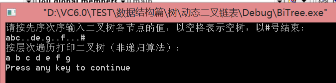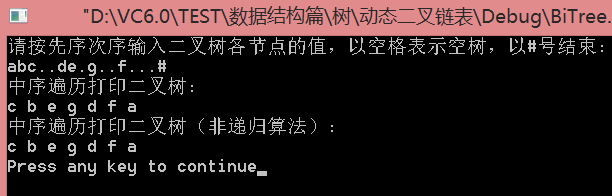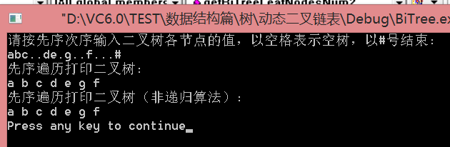 测试按先序序列输入:abc..de.g..f...#,点号代表空树,#为输入结束符