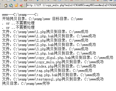 我写了2个PHP文件;1.copy_digui.php递归拷贝目录的,2.copy_mulu.php for循环拷贝的;在输入框输入 拷贝目录 目标目录的路径(注意:目标目录不能是拷贝目录的子目录,这样会死循环),就会在目标目录生成和拷贝目录同名的文件夹,里面文件结构和其相同,for时顺序是不符的,因为是先考文件,后目录的