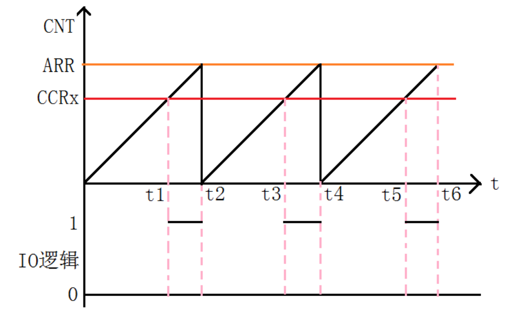 TIMx_CCR1: 在输出模式下,该寄存器的值与 CNT 的值比较,根据比较结果产生相应动作。利用这点, 我们通过修改这个寄存器的值,就可以控制 PWM 的输出脉宽了。