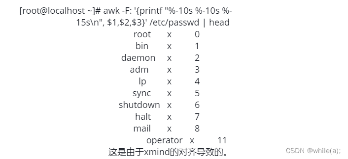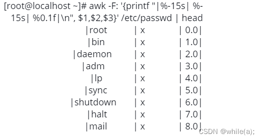 [root@localhost ~]# awk -F: '{if($3==0){print $1," is admin "}else if ($3>999){print $1," is user"}else {print $1, " is sofo user"}}' /etc/passwd