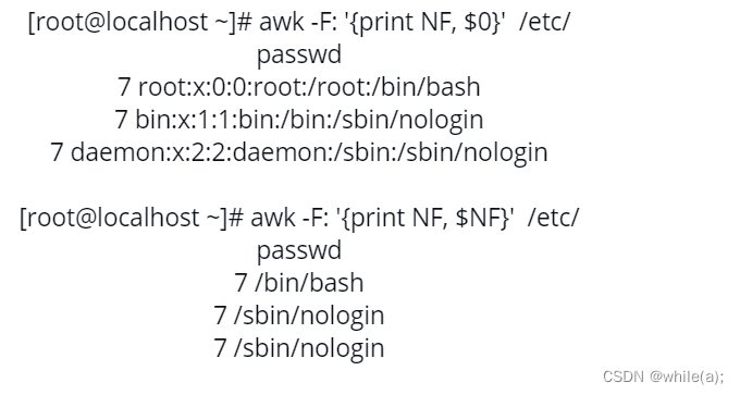 $NF 最后一列的字段内容;{}行处理;把统计的对象,作为索引。每次递增。Print i 打印索引;Shells[i] 数组加索引,显示的就是值。