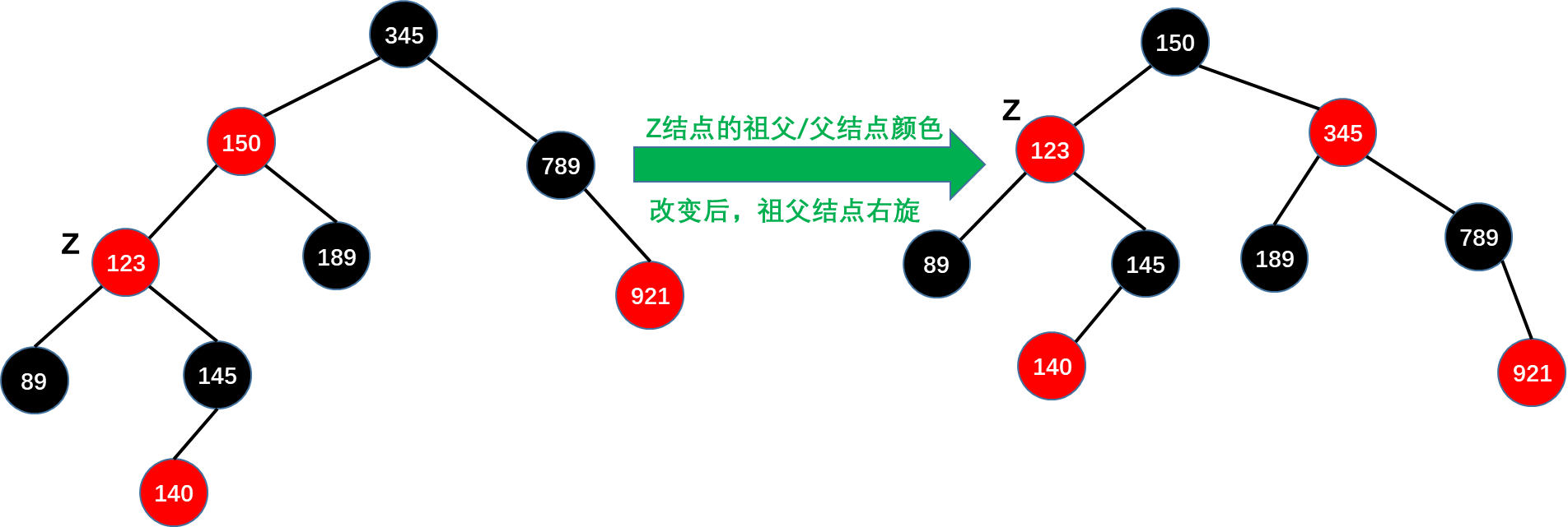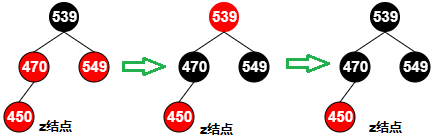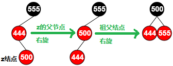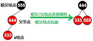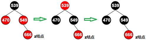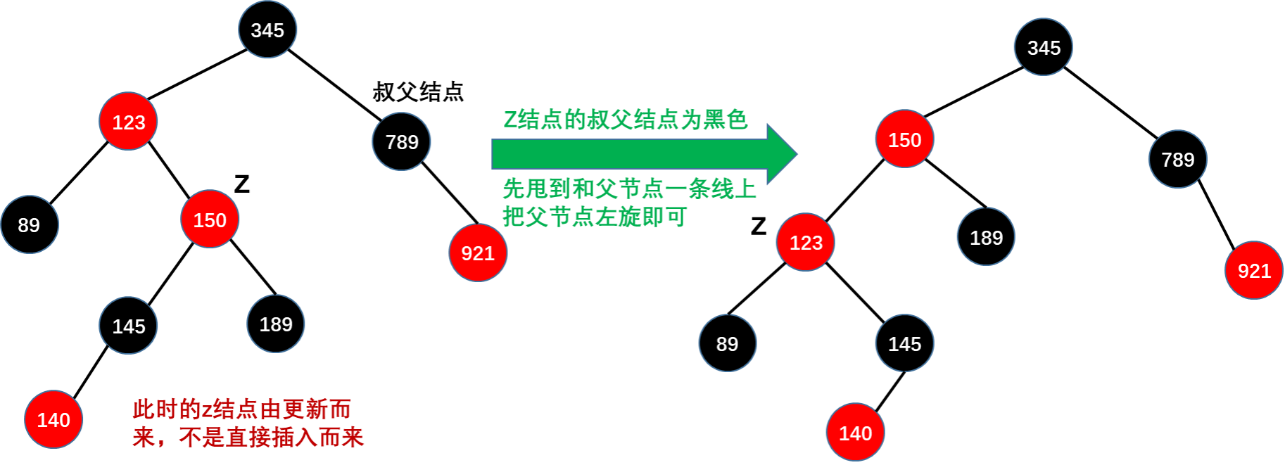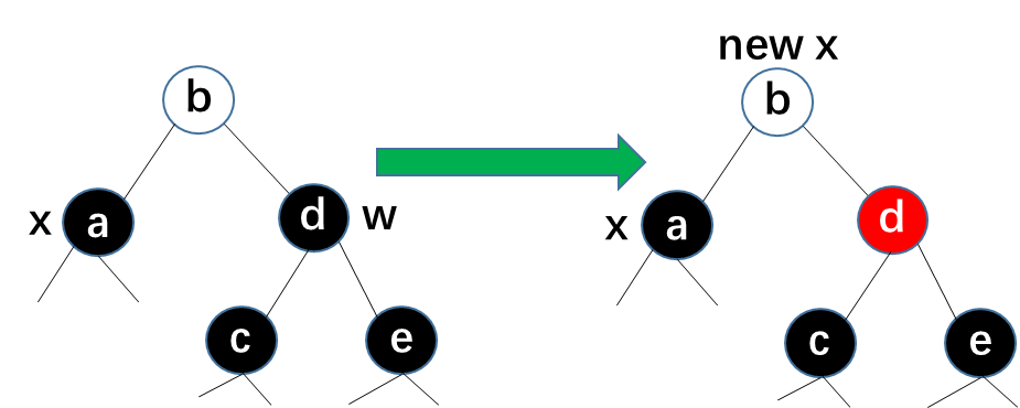 只需要把兄弟结点变红,就使得两边的黑高相同了,但是x.parent结点b的颜色不知道,如果为红色,就会跳出while循环,在最后会再给x重新赋为黑色。