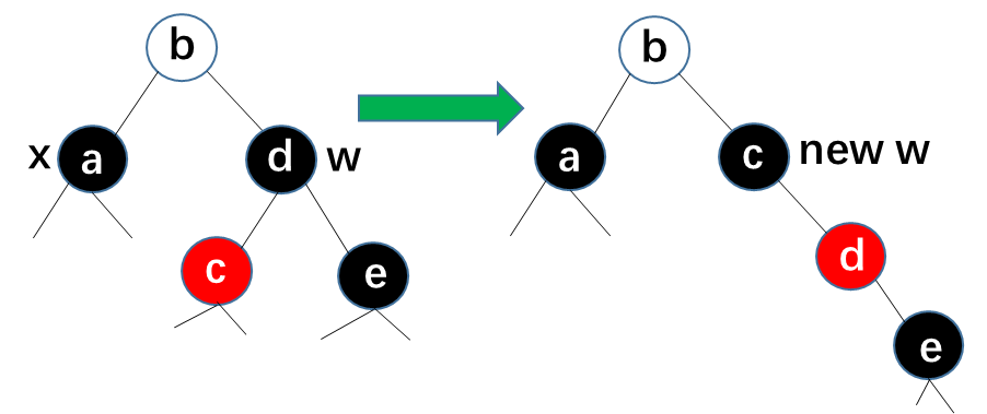 w = x->parent->right; // 右旋后,更新兄弟结点w,进入情况4