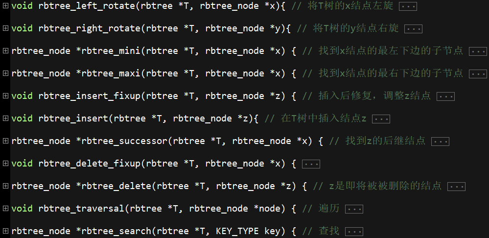 左旋、右旋、找x的最左子结点、找x的最右子节点、插入结点、插入后修复、找z的后继结点、删除结点、删除后修复、遍历树、查找某结点。