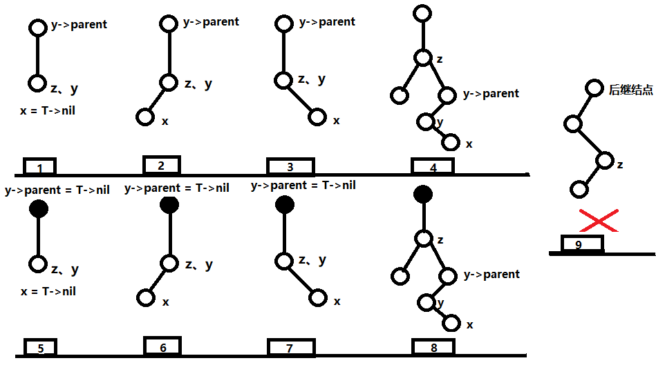 第1、5情况,可以直接删除,第2、3、6、7删除后用其孩子顶替z的位置,第4、8情况,先找到后继结点,然后把后继结点的值传给z结点,再去删除后继结点y。注意,上面一排,z不是根结点,下面一排z是根结点,根结点的父结点用T->nil哨兵代替(红黑树种,根结点的父亲和叶子结点的孩子都用哨兵T->nil代替,而不是像二叉树的NULL这种)。然后,不会出现情况9,它的后继结点在上面,因为这种情况,z没有右孩子,而没有右孩子的时候,我们按照情况1、2或者5、6处理。这样就完美对照开头说的第一、第二、第三。