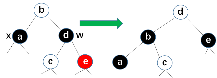 情况3:x的兄弟结点w是黑色的,w的左孩子是红色的,右孩子是黑色的。