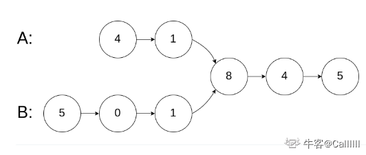 显然第一个公共结点为8,但是链表A头结点到8的长度为2,链表B头结点到8的长度为3,显然不好办?