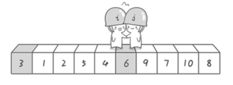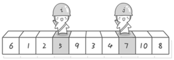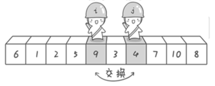 现在交换哨兵i和哨兵j所指向的元素的值。交换之后的序列如下。