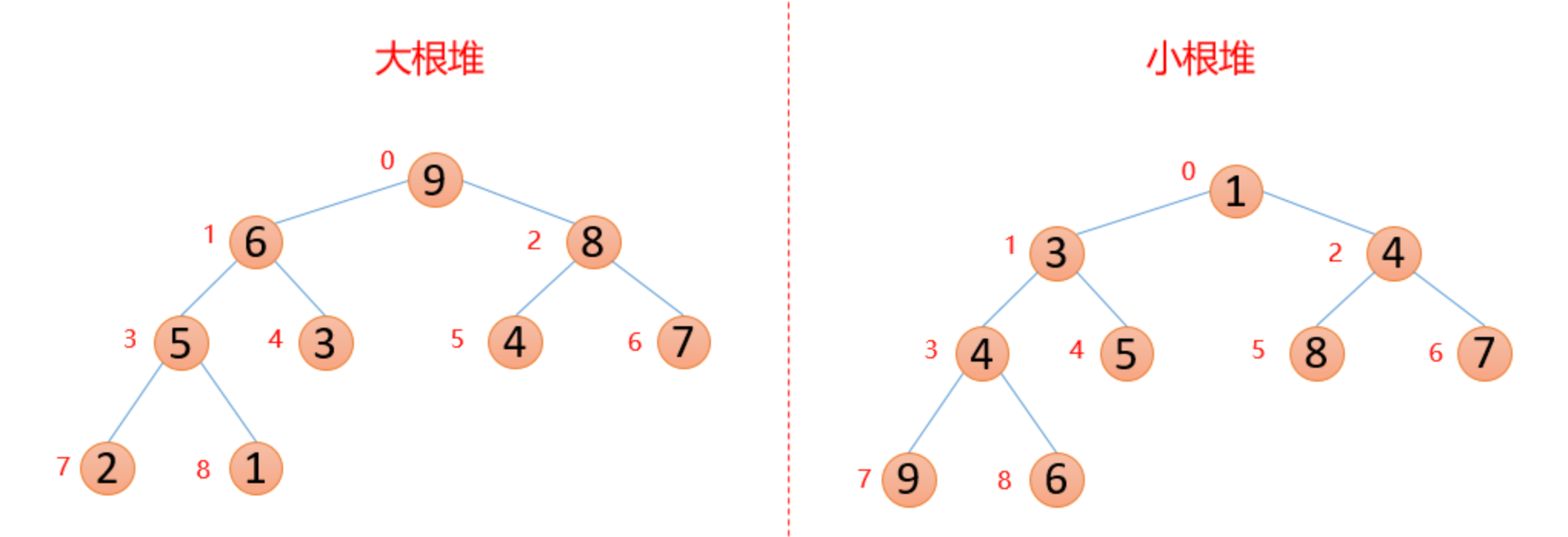 性质:每个结点的值都大于其左孩子和右孩子结点的值,称之为大根堆;每个结点的值都小于其左孩子和右孩子结点的值,称之为小根堆。如下图