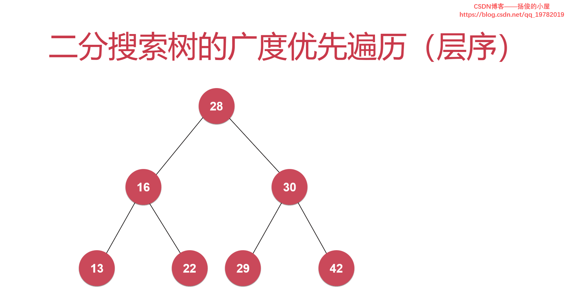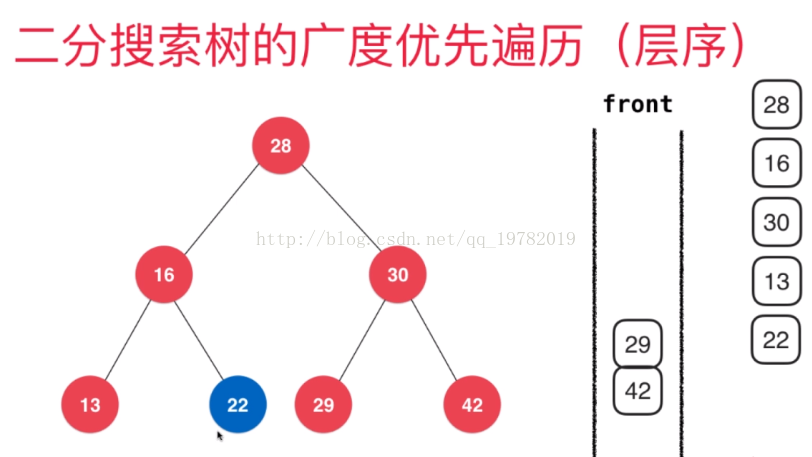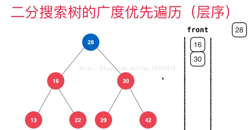 上图中,我们发现出队的顺序都是按照层序遍历出队的。28节点带了他的两个子节点16和30入队,16带了他的两个子节点13,22入队,30带了他的两个子节点29,42.......。依此循环,可以保证二叉树是一层一层被遍历的。