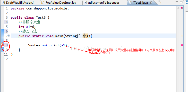 静态的方法可以在没有创建实例时使用,而申明为非静态的成员变量是一个对象属性,它只有在对象存在时引用,因此如果在对象未创建实例时我们在静态方法中调用了非静态成员方法自然是非法的,不知道引用的是哪个对象的非静态方法,所以编译器会在这种时候给各错误. 修改如下: