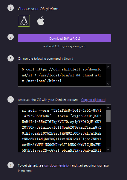 这一步完成了两件事:使用ShiftLeft的API将您机器上运行的CLI与您的ShiftLeft帐户链接起来(调用该API需要包含令牌)。