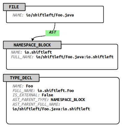 程序结构与将程序组织成文件、名称空间和包有关。一个程序由零个或多个文件(类型文件)组成,每个文件包含一个或多个名称空间块(类型为NAMESPACE_BLOCK)。名称空间块包含类型和方法声明(类型TYPE_DECL和方法)。从文件到名称空间块必须存在抽象语法树(AST)边缘。名称空间块下面的结构元素没有通过边缘连接到它们的AST父元素。相反,使用AST_PARENT_TYPE和AST_PARENT_FULL_NAME属性通知后端方法(类型方法)和类型声明(类型TYPE_DECL)的AST关系。因此,属性FULL_NAME必须是三个节点类型方法TYPE_DECL和NAMESPACE_BLOCK的唯一标识符。该图显示了如何在CPG中表示Java类定义。