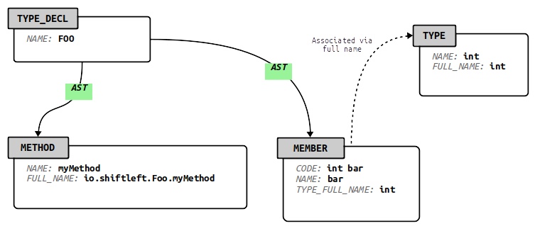 在CPG中,每个类型声明都由指定的类型声明节点(type TYPE_DECL)表示,该节点至少有一个全称属性。成员变量(类型成员)、方法声明(类型方法)和类型参数(类型TYPE_PARAMETER)通过AST边连接到类型声明,这些边起源于类型声明。继承关系通过INHERITS_FROM边到零个或多个其他类型声明(类型TYPE_DECL)来表示,这表明源类型声明继承自目标声明。