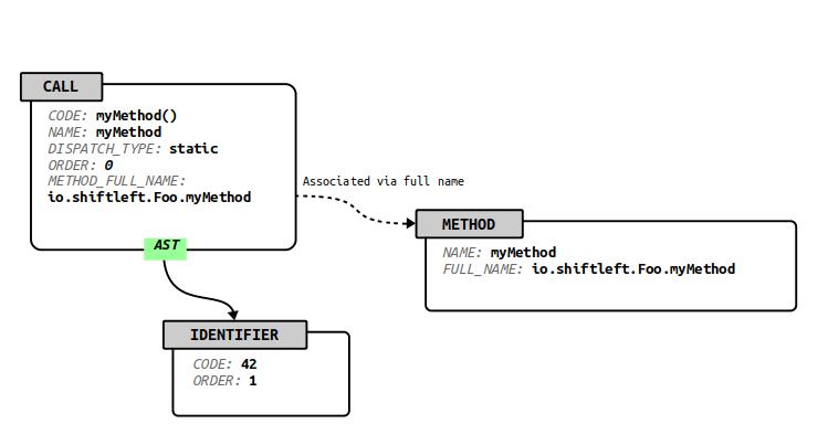 在CPG中,方法调用由指定的调用节点(type CALL)表示。参数可以是标识符(type IDENTIFIER)、文字(type LITERAL)、其他调用(type CALL)或方法引用(type METHOD_REF)。每个参数都有一个参数索引属性(type ARGUMENT_INDEX)来指示它与哪个参数相关联。调用通过传出的AST边连接到它们的参数,并通过它们的METHOD_FULL_NAME属性关联到被调用的方法。