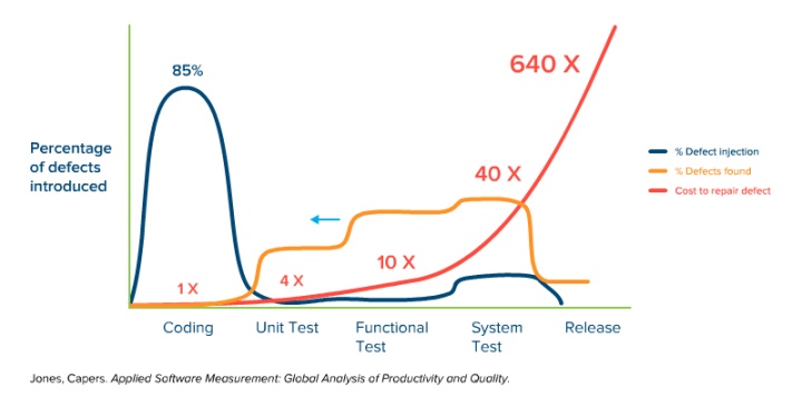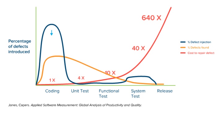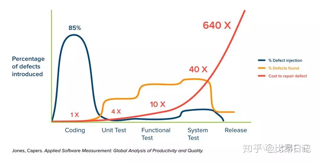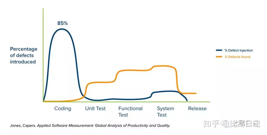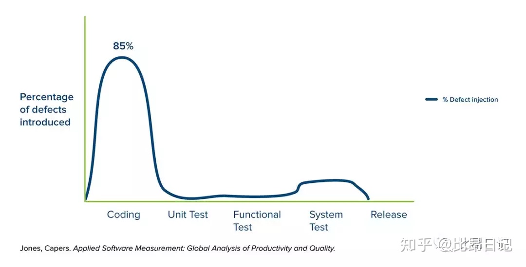 Capters Jones 有个Global的效能和质量分析图,列出了常见的软件开发过程中defect发现的阶段,可以看到,大部分的问题在编码阶段引入。