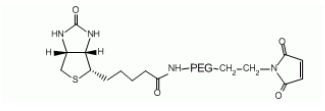 Biotin-PEG-Mal,聚乙二醇化生物素对亲和素或链霉亲和素有很高的亲和力。生物素/亲和素体系在生物分子检测和分离中有着广泛的应用。马来酰亚胺在pH 6.5~7.5范围内易与硫醇基反应,形成稳定的硫醚键。聚乙二醇修饰药物能增加溶解性和稳定性,降低带电分子表面非特异性结合,降低免疫原性。