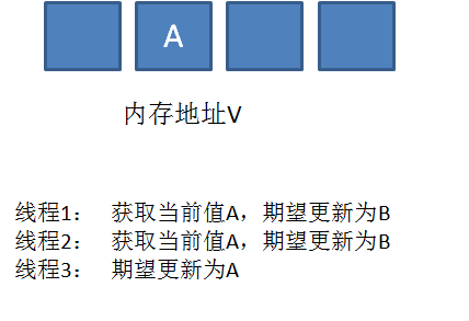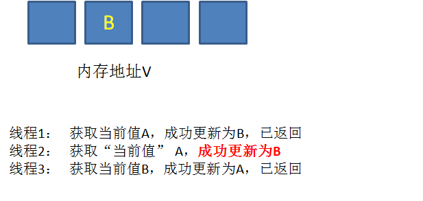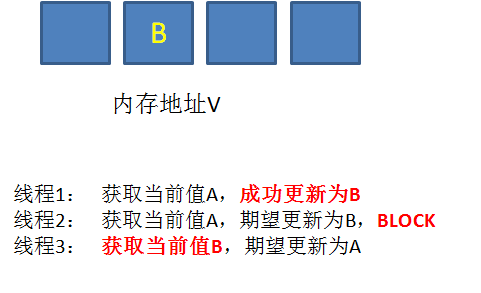 最后,线程2终于恢复了运行状态,由于阻塞之前已经获得了“当前值”A,并且经过compare检测,内存地址V中的实际值也是A,所以成功把变量值A更新成了B。