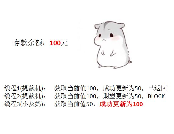 当我们举一个提款机的例子。假设有一个遵循CAS原理的提款机,小灰有100元存款,要用这个提款机来提款50元。