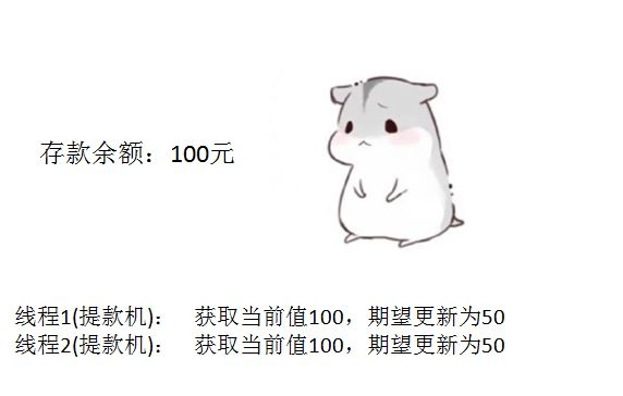 由于提款机硬件出了点小问题,小灰的提款操作被同时提交两次,开启了两个线程,两个线程都是获取当前值100元,要更新成50元。