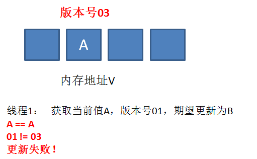 我们仍然以最初的例子来说明一下,假设地址V中存储着变量值A,当前版本号是01。线程1获得了当前值A和版本号01,想要更新为B,但是被阻塞了。
