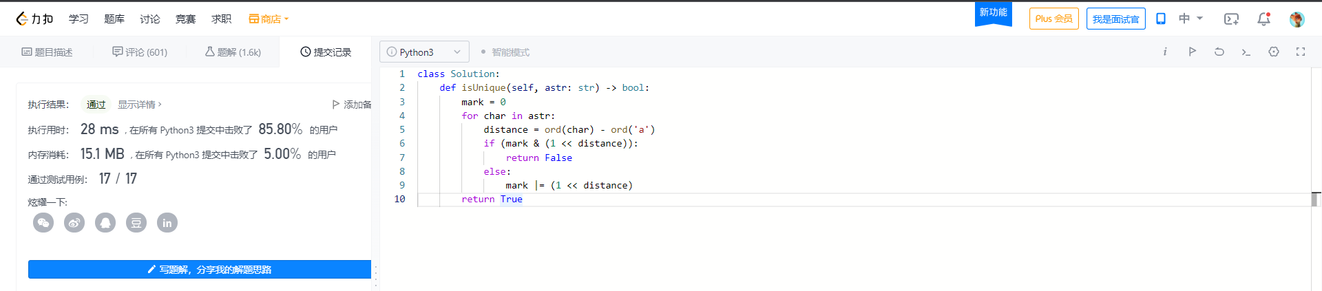 以上就是精明狗最近收集整理的关于面试题 01.01. 判定字符是否唯一————简单的全部内容,更多相关面试题内容请搜索靠谱客的其他文章。