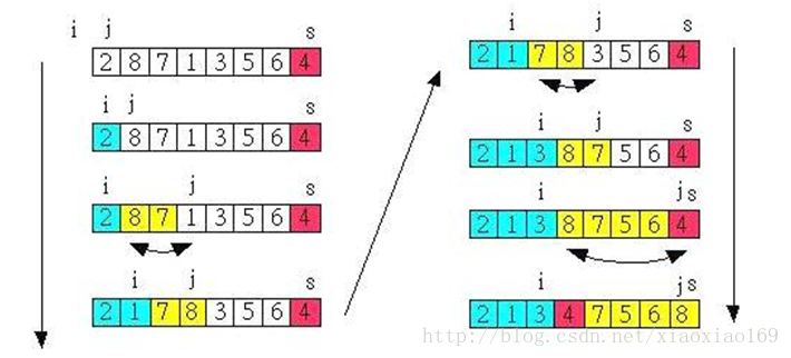 在排序的过程中,i 与 j 都会不断的往右进行比较与交换,最后数列会变为以下的状态: