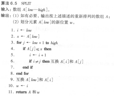 划分伪代码(找出快速排序的w位置,使得w左边所有的数小于它,w右边所有的数大于它)