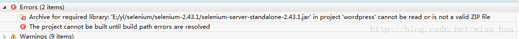 右侧Problems视图报错 Archive for required library: ‘E:ylseleniumselenium-2.43.1selenium-server-standalone-2.43.1.jar ‘ cannot be read or is not a valid ZIP file