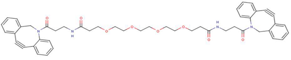 产品描述:DBCO-PEG4-DBCO是一种含有两个DBCO基团和亲水性PEG间隔臂的同双功能PEG连接体。DBCO将与含叠氮化物的化合物或生物分子反应,在无铜催化剂的情况下形成稳定的三唑键。亲水性PEG间隔臂可以增加水溶性和膜渗透性。