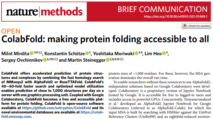 Mirdita, M., Schütze, K., Moriwaki, Y. et al. ColabFold: making protein folding accessible to all. Nat Methods (2022). https://doi.org/10.1038/s41592-022-01488-1