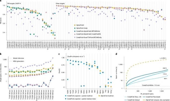 为了比较预测结构的准确性,研究人员比较了AlphaFold2 (带模板的默认设置)、AlphaFold-Colab (无模板)、ColabFold-RoseTTAFold-BFD/MGnify、ColabFold-AlphaFold2-BFD/MGnify和ColabFold-AlphaFold2-ColabFoldDB对CASP14竞赛中所有目标的模板建模分数 (TM-score) (图2a)。所有三种ColabFold模式都是在没有模板的情况下执行的。在考虑到MSA生成 (图2b) 和模型推理的情况下,ColabFold的单次预测平均比AlphaFold2和AlphaFold-Colab快5倍。