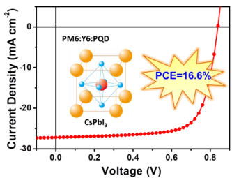 将全无机钙钛矿CsPbI3量子点(PQD)掺入稠环电子受体有机太阳能电池中。PQD具有强吸收、强荧光、高载流子迁移率和高介电常数等特性。PQD的引入可同时提高器件的开路电压、短路电流密度和填充因子;基