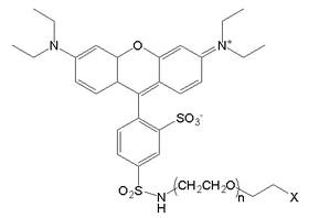 Rhodamine B标记的聚乙二醇是一种荧光聚乙二醇衍生物,其吸收波长max为570 nm,发射波长约为595 nm。罗丹明B的粉红色和红色荧光很容易被追踪。另一活性基团羧基使得这些荧光PEG衍生物很容易与其他带有氨基或者羟基分子或材料表面结合。