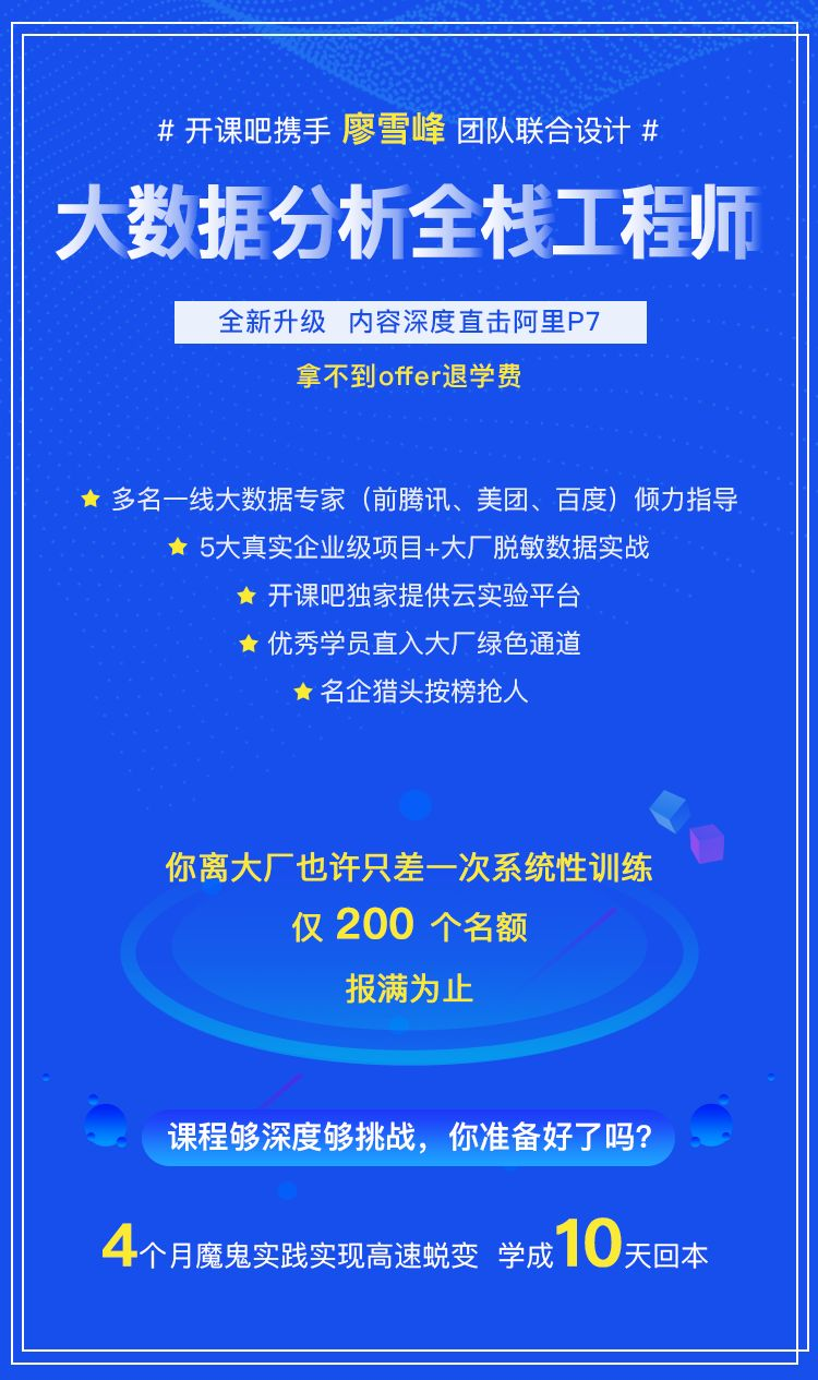 以上就是能干导师最近收集整理的关于拿不到 offer 免费学 | 廖雪峰的“大数据分析全栈工程师”课程第11期开始招生...的全部内容,更多相关拿不到内容请搜索靠谱客的其他文章。