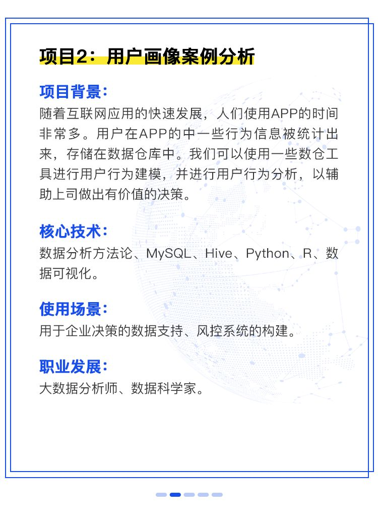 2. 既有深度,又有广度:目前市面上几乎所有的数据分析课都是基于Python和Excel的那一套,再穿插点数据挖掘的入门,千篇一律。我们调研后发现,几乎所有大型互联网企业招聘数据分析师都要求掌握大数据平台的数据分析,如Hive,而课程完全包含这些,这是我们课程的独家特色,且占比达整个课程的50%左右,这块就是拉开薪资的地方,就是区分传统数据分析师和大数据分析师的地方。