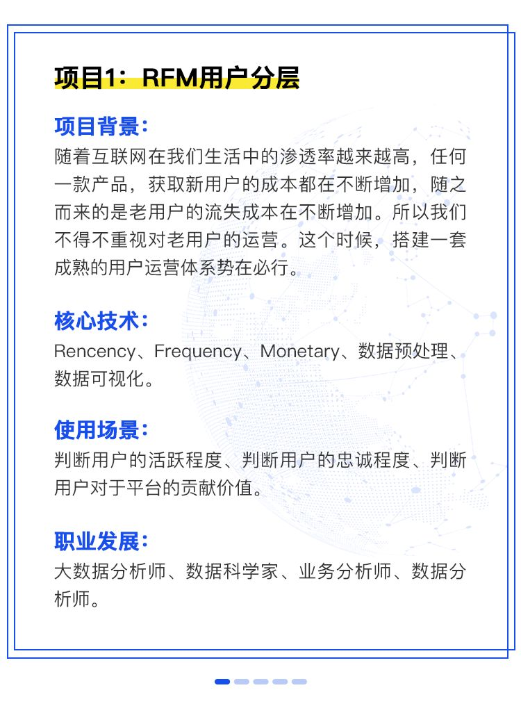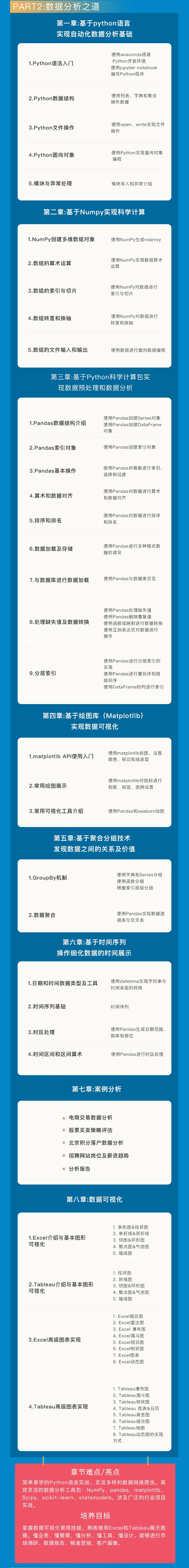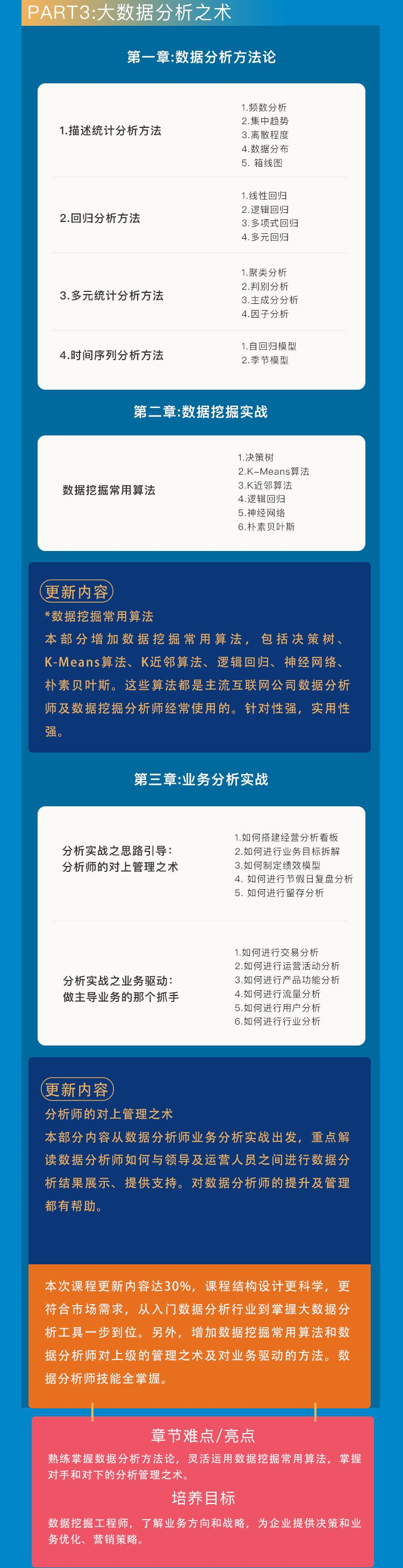1. 内容由浅入深,层层递进:课程第一部分完全按照零基础的学员能力设计,涵盖基础的Excel操作,Excel数据可视化,认识和熟悉工具;紧接着第二部分刚开始的Python基础,也是照顾零基础的学员,慢慢的深入,到后面的数据科学库numpy、pandas等;再到第三部分的基于Hadoop平台的数据分析和建模,数据挖掘算法,层层递进和加深,尽可能让有基础和无基础的同学都能跟得上并学会,在学员入门过后再加深难度。