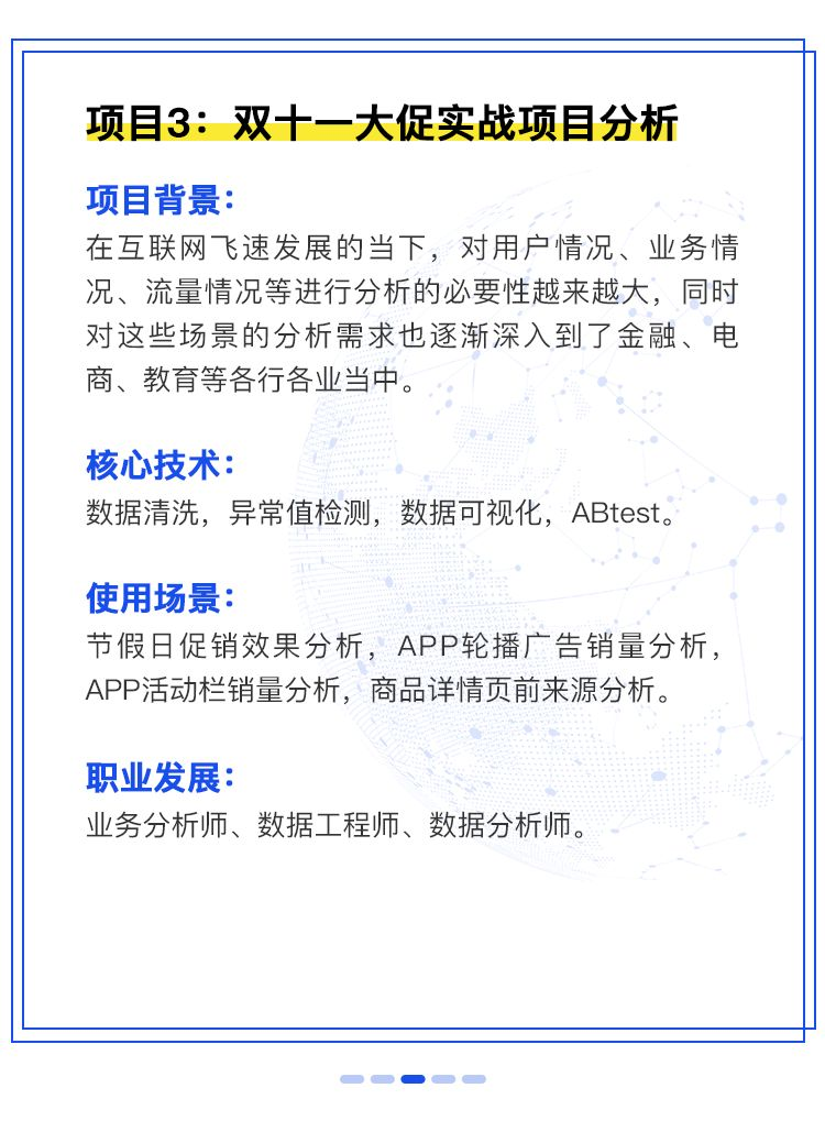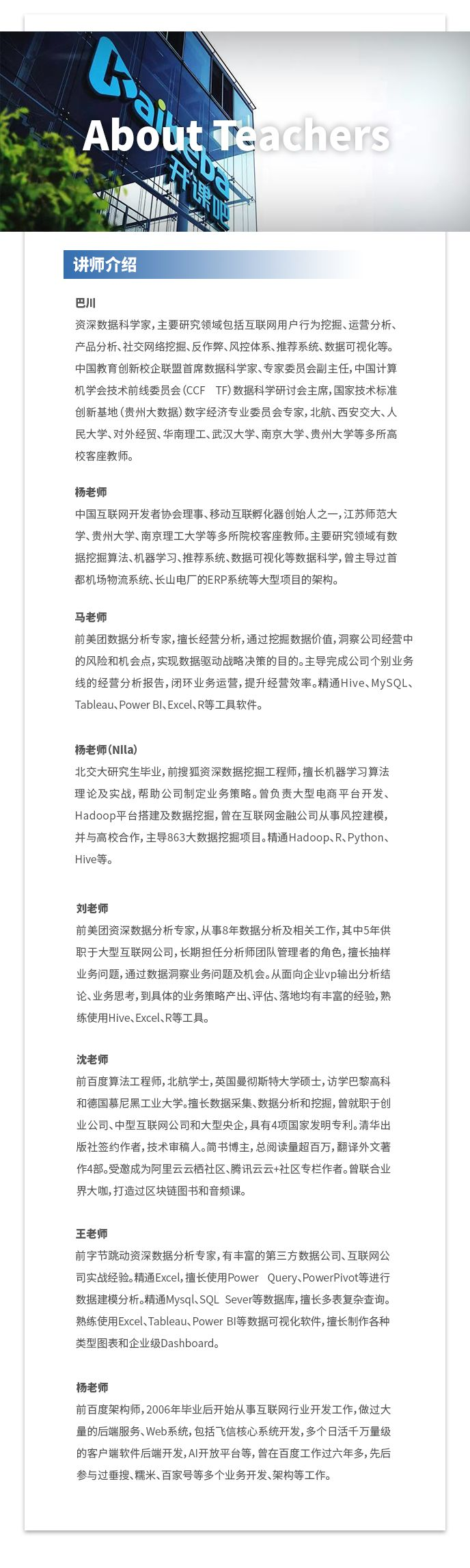 3. 纯大型互联网企业师资:课程的设计和讲解都来源于纯一线大型互联网企业导师(top10互联网企业),导师即是讲师,也是企业里的数据分析师,也是企业的数据分析师面试官,掌握和熟悉一切主流的技术方案和方法论。来源于企业,输出到企业,这是我们的课程跟其他课程的本质区别。