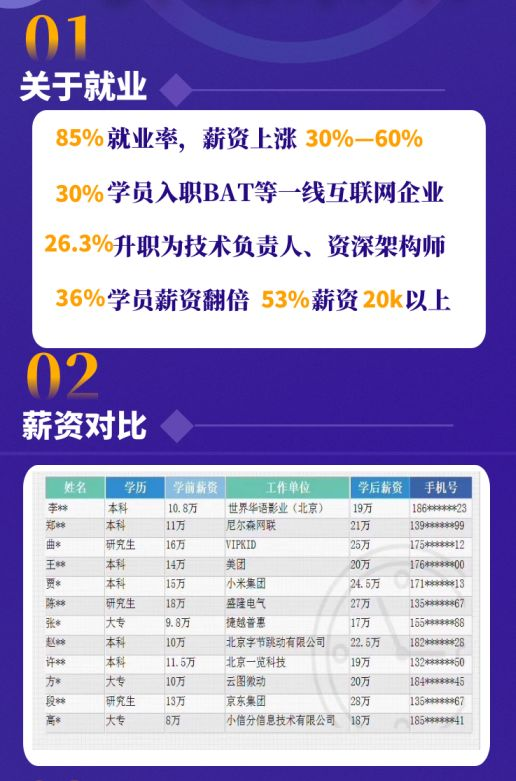 1.2 关于退还学费:报名就业班的同学,报名伊始既签订合同,若上完课程拿不到 offer 或者 offer 初次就业薪资达不到年薪21万,既退还学费。