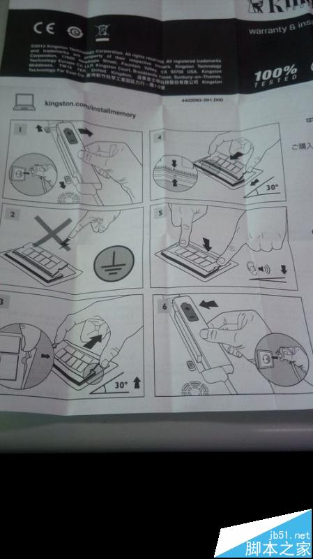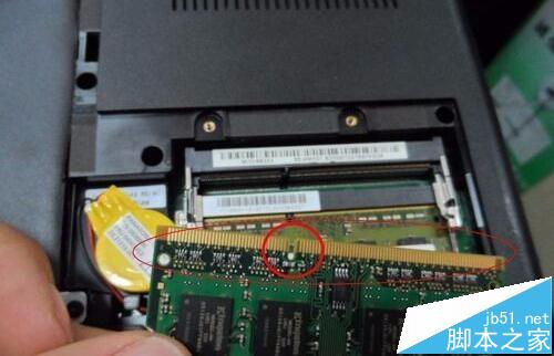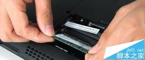 4、最重要的来了!你会发现原装内存条上侧还有一个内存通道(现在大部分电脑几乎所有型号的笔记本电脑都支持双通道内存输入),双手持内存条与电脑(或桌面)形成大概三十度角,将内存条用力插到卡槽内,确认内存条铜片部分完全插入卡槽,然后向下按住内存条直到两侧的金属片完全卡住内存条。