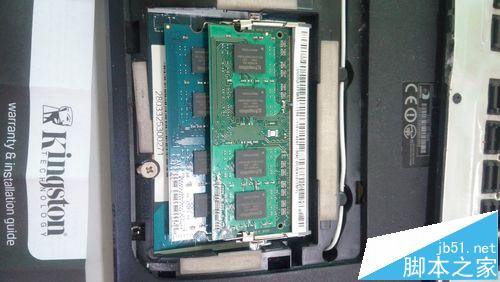 3、打开后盖后可以看到电脑里原装的内存条(鸿基自带的金士顿DDR3 1333MHZ 2GB)