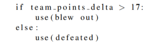 如3.1中所提出的,我们使用高斯分布来模拟数值和短语之间的对齐概率。因此,我们的模型不仅可以告诉我们这个词的来源,还可以告诉我们它与之对齐的数字的分布。例如,在训练之后,我们的模型成功地将“blow out”与分数差异对齐,并且表明当使用此短语时,分数差异的平均值为17。有了这些信息,我们可以在对齐的单词上设置“触发器”。 触发器是一种确定在何种条件下可以使用何种模板的方案。 例如,只有在得分差异大约为17时才能使用与“得分差异”对齐的“blow out”模板,其中blow out的概率高于defeated的概率。 所以我们可以得到这样的规则: