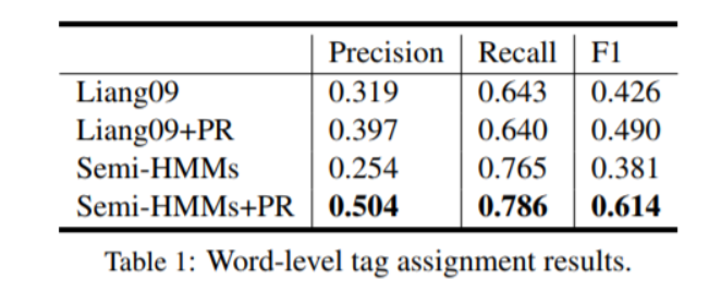 在Liang等人的原始模型中,垃圾收集问题是严重的,这意味着大多数单词错误地与应该保持不对齐的不频繁字段对齐(i.e, aligned to null) 。在这里,我们结合了Graca等人提出的后验正则化,它可以在具有潜在变量的模型中添加约束,同时保持模型易于处理。在实践中,我们设置了未对齐单词数量的下限,这可以显着减轻垃圾收集问题。