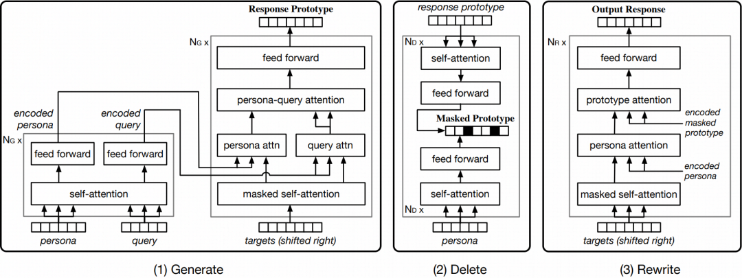 这种三阶段 GDR 模型包含一个原型回复生成器(生成阶段)、一个一致性匹配模型(删除阶段)、一个掩码式原型回复重写器(重写阶段)。