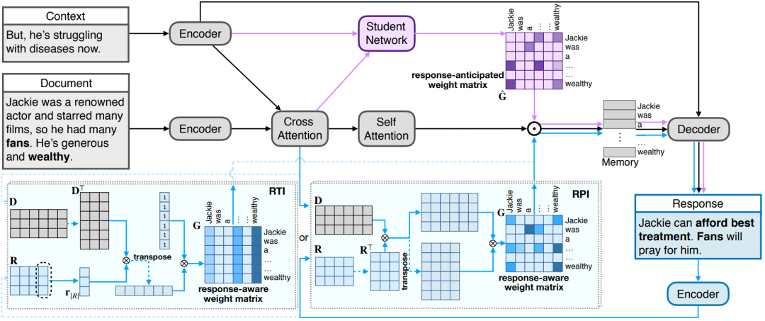 众所周知,神经对话模型可以生成不错的回复,但其回复内容往往缺乏信息量。基于阅读的对话模式(Conversing by Reading)可以大大提高回复中的信息量,具体而言,这类模式会基于给定的外部文档中的信息开展对话。在已有的基于阅读对话的工作中,外部文档是通过(1)创建一个上下文感知的文档存储模块来整合来自文档和对话上下文的信息,然后(2)利用该存储模块来帮助生成回复。在本文中,我们认为在构建文档存储模块时,应该考虑“我们可能的回复是什么样的”。具体地,新提出的模型是使用教师-学生框架实现的。我们为教师模型提供了外部文档、上下文和真实的回复,并让教师模型学习了如何从三种信息源中构建“可感知回复”的文档存储模块。学生模型可从外部文档、上下文和教师模型中学习如何构建“回复预知”的文档存储模块。实验结果表明,新提出的模型优于 CbR 任务的其它最新模型。